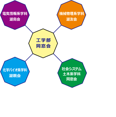工学部の各学科に同窓会が組織されており、それらの密接な連携を基礎として、工学部同窓会が成り立っています。